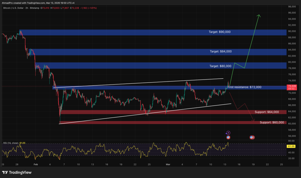 A clean breakout above $72,000 opens $80,000 as the first real target, then $84,000, and the full run to $90,000 if momentum carries.